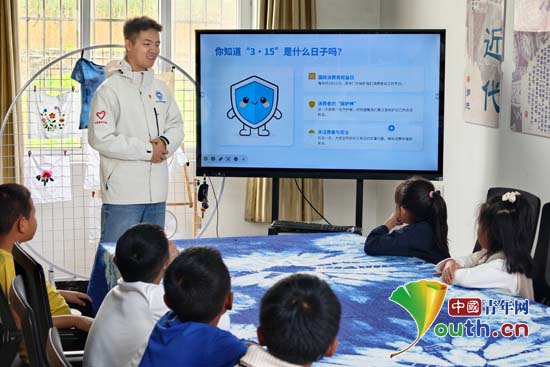 东北大学研支团在云南省昌宁县新华村“知行儿童之家”开展消费者权益保知识科普活动。图为研支团志愿者为孩子们科普消费者权益知识。东北大学研支团供图