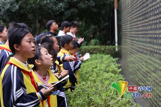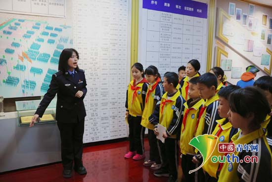 在贵州公安英烈墙前,孩子们了解英烈们为守护平安献出生命的感人事迹。东北农业大学研支团供图