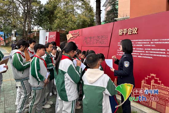 在贵州警察学院长征文化长廊,孩子们通过图文展板和志愿者的生动讲述,了解红军长征途中在贵州发生的故事。东北农业大学研支团供图