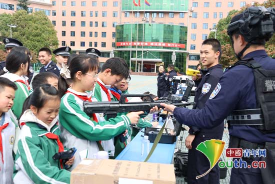 贵州警察学院的志愿者为孩子们展示警务装备。东北农业大学研支团供图