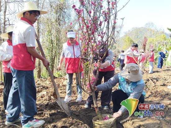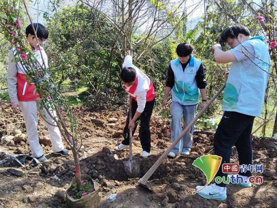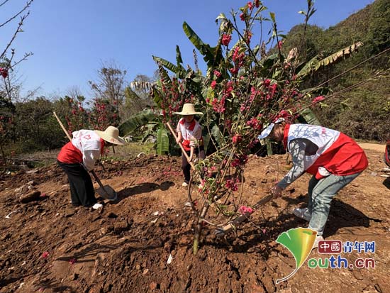 广西壮族自治区桂林市恭城瑶族自治县西部计划志愿者服务队在平安镇北洞源村开展“青春添绿,筑梦瑶乡”义务植树活动。图为志愿者们在挖坑。向红燕摄
