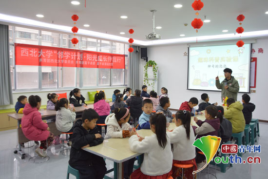 在开班第一课上,研支团成员带领孩子们进行科学小实验。西北大学研支团供图