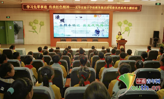 四川农业大学第28届研究生支教团携手四川省成都市温江区光华实验小学举办“英烈永铭记 薪火代代传”清明祭扫活动。图为研支团成员冯思源开展宣讲活动。四川农业大学研究生支教团供图