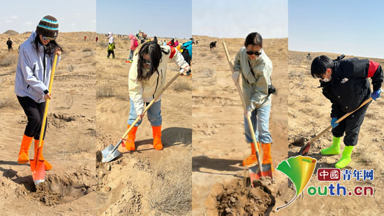 在仲麟公益基地,研支团成员在其他志愿者指导下,参与回填、浇水等植树工作,以青春力量为沙漠添绿。