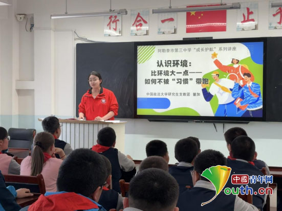 在新疆维吾尔自治区阿勒泰市第三中学,中国政法大学第27届研支团新疆分团成员曾加开展题为《认识环境:比环境大一点——如何不被“习惯”带跑》的专题讲座活动。中国政法大学研支团供图