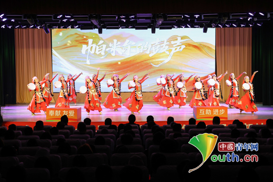 4月7日,聊城大学第四届西部计划文化节开幕式在西校区礼堂举行。图为活动开幕式上表演的舞蹈《帕米尔的鼓声》。聊城大学团委供图