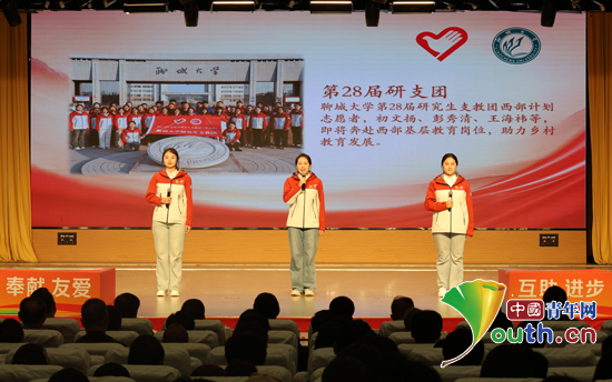 即将奔赴西部基层开展支教服务的聊城大学第28届研支团成员代表表达服务西部的坚定信念。聊城大学团委供图