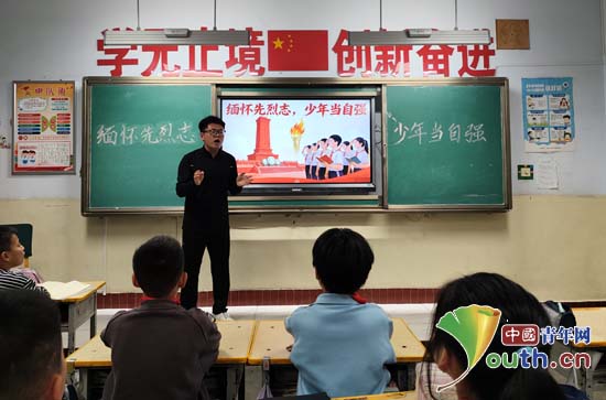 西安建筑科技大学研支团在服务地开展知识宣讲活动。图为研支团志愿者张凡在甘肃省民乐县六坝镇寄宿制小学为学生讲述先辈的革命故事。西安建筑科技大学研支团供图