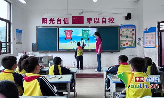 研支团成员在龙里县生态城实验学校组织开展垃圾分类互动游戏。东北农业大学研支团供图