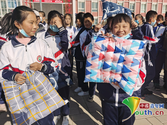 青岛科技大学研支团在彭阳县开展“再续山海情”暖冬行动。图为孩子们领取坐垫。青岛科技大学研支团 供图