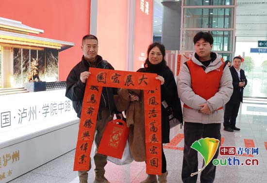 志愿者为旅客送上春联和福字。团龙马潭区委供图