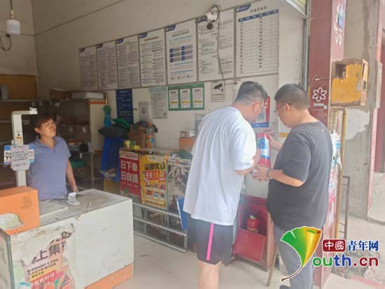 在四川省射洪市武安镇,志愿者王筠澍(左二)和同事走进商铺开展安全检查。王筠澍供图
