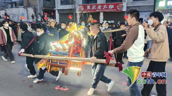 正月十九那天,天还未黑,街上早已人流如织。江南江北的村寨灯火次第点亮,白龙江像一条镶着光边的绸带,把两岸的热闹连在一起。夜色降临后,锣鼓齐鸣,队伍缓缓而来。抬轿的年轻人步伐稳健,鼓手敲出整齐有力的节奏,宫灯在风中轻晃,映出一张张兴奋的面孔。