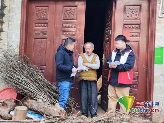 2025年1月,志愿者文显雄(右)与同事走村入户开展森林防火宣传。文显雄供图
