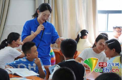 在贵州省息烽县底寨中学,安徽理工大学研支团成员梁安琪在课堂上与学生互动。梁安琪供图