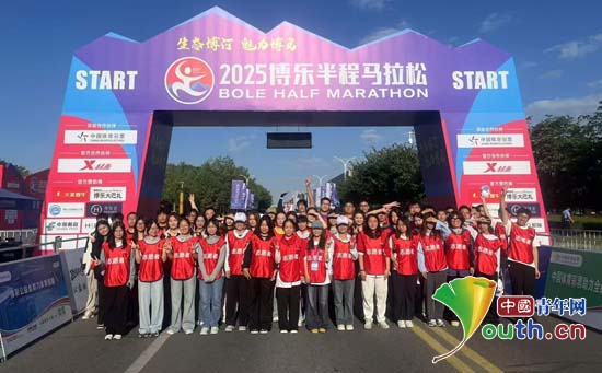 姜欣娜参与博乐半程马拉松赛事服务并与志愿者们合影。姜欣娜供图