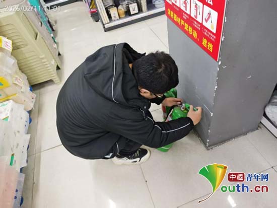罗钊在超市检查灭火器。罗钊供图