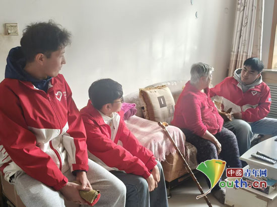 巴合达尔(左一)与志愿者伙伴一起看望老军垦。巴合达尔供图