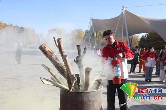 巴合达尔为孩子们展示灭火器的操作与使用。巴合达尔供图