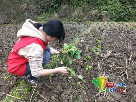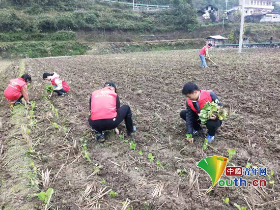 谢静帮老奶奶在田地里栽种油菜。潘妹 供图