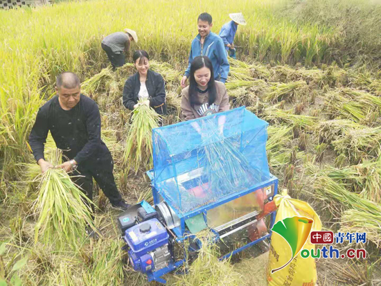 谢静(中间穿黑色衣服)和同事一起开展秋粮抢收服务。潘妹 供图