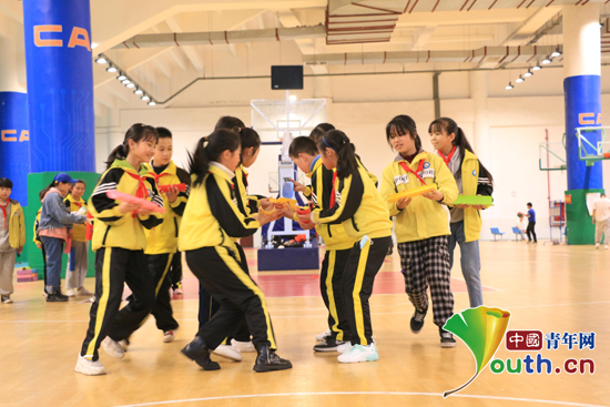 午休结束后,志愿者们组织孩子们在贵州大学体育馆开展素质拓展活动。主持人将同学们分为三组,各小组依次进行游戏珠行万里、摸石过河、同舟共济、神笔马良等团队游戏,用时最短的队伍获胜。活动现场充满着同学们的阵阵欢笑声,成功后的欢呼声、同伴的鼓励声,每位同学都在全力以赴、做到最好,同学们也在精彩纷呈的游戏中磨练着意志、塑造着精神品质、凝聚着团队意识、激发着个人潜能。
