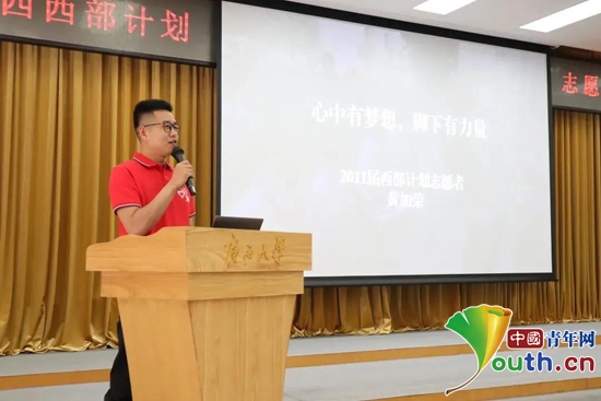 2011年西部计划志愿者,现任中国青年志愿者协会常务理事、全国青联委员、广西炭火行动志愿者协会荣誉会长的黄加荣向在场师生分享了加入西部计划和成立广西炭火行动志愿者协会的初衷。在现场,他用实际行动展示了作为一名西部计划志愿者的使命与担当。