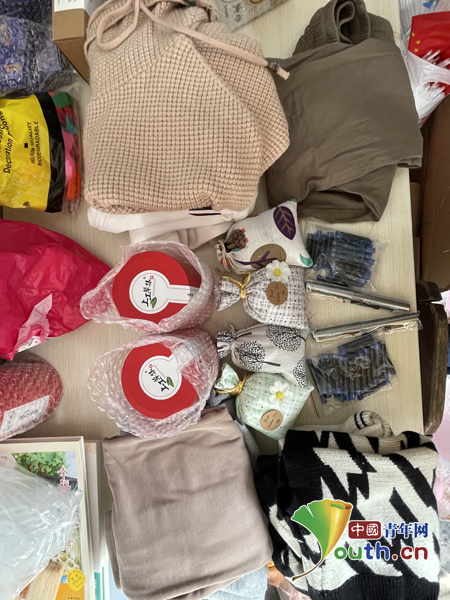 图为研支团成员为留守学生准备的爱心衣物、文具和中医药文化产品。南京中医药大学研支团 供图
