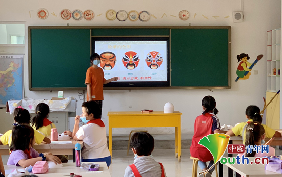 河北工业大学第23届研支团在若羌县第三小学开设戏曲文化社团,开展京剧脸谱绘画活动。图为成员原源在为学生讲解京剧脸谱。河北工业大学研支团 供图