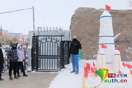 学生介绍自己的雪雕作品。天津大学研支团 供图