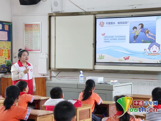 6月1日上午,广西壮族自治区恭城县西部计划志愿者服务队赴恭城镇满塘小学开展"珍爱生命·预防溺水"主题班会。图为志愿者为孩子们介绍防溺水知识。恭城团县委 供图
