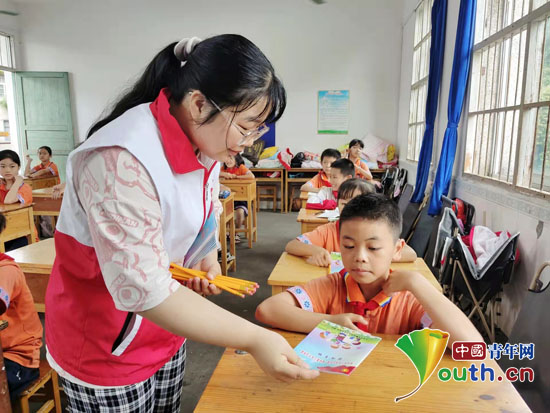 志愿者为孩子们发放《防溺水安全教育手册》。恭城团县委 供图