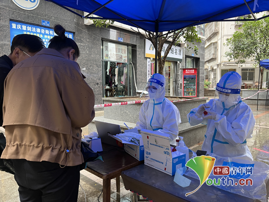 工作当天,志愿者们凌晨六点迅速集结,紧锣密鼓地开始场地布置。在翠屏社区核酸采样点,身穿防护服的志愿者付丽峰和程诺正为群众进行信息登记及采样。她们亲身示范,热情服务,手把手帮助老年人使用“重庆健康出行一码通”等小程序,用心用情为全员核酸检测跑出“加速度”。