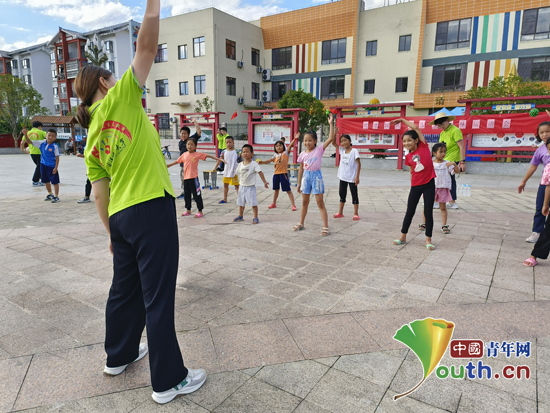 志愿者带领小朋友们做赛前热身运动。中国青年网通讯员卢凯新供图