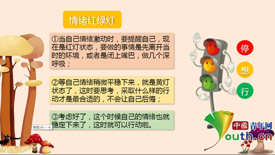 研支团成员张天一从居家生活中容易产生的消极情绪为切入点,举例演示运用“红绿灯法”帮助学生们消除不良情绪。就居家学习中容易与父母产生矛盾这一问题,张天一希望学生们能站在父母的角度看待问题,体谅父母的不易,多向父母表达自己的想法与感受,帮助父母多做一些力所能及的家务,营造健康快乐的家庭氛围。