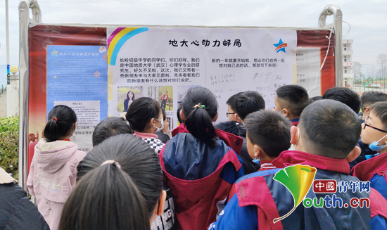 支教期间,研支团在服务地组织开展了“心动力”邮局活动。活动中,研支团成员联合地大(武汉)心理研究所师生,针对心理健康普查中学生出现的学习焦虑、青春期恋爱、人际关系等问题,通过书信、海报互动的形式为服务地的孩子们分享心理知识,疏解他们心中的烦恼,培育他们健康成长积极向上的心理状态。