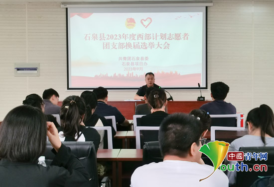 石泉县召开2023年度西部计划志愿者临时团支部换届选举大会。石泉团县委供图