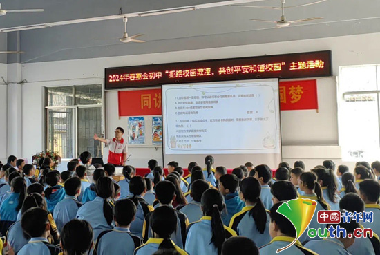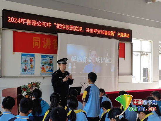 为加强法治教育,建设平安、和谐校园,促进青少年身心健康发展,近日,广西壮族自治区恭城瑶族自治县西部计划志愿者服务队联合嘉会镇派出所,在嘉会镇初级中学开展“拒绝校园欺凌·守护‘少年的你’”主题志愿服务活动。