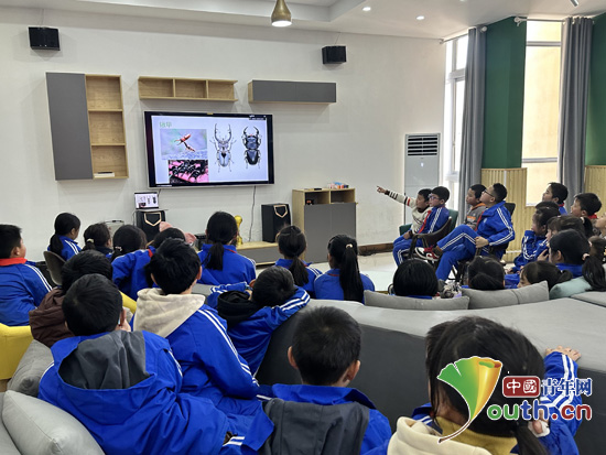南京农业大学植物保护学院本科生、中华虎凤蝶保护协会成员以生动易懂的语言,为孩子们揭开了昆虫的神秘面纱。他从“什么是昆虫”的基础知识入手,通过图文并茂的PPT展示,系统讲解了昆虫的身体结构、分类特征及生态价值。课堂还结合“真假蜜蜂”“像小提琴一样的昆虫”等趣味案例,将专业知识转化为童趣故事,引发了孩子们的连连惊叹。