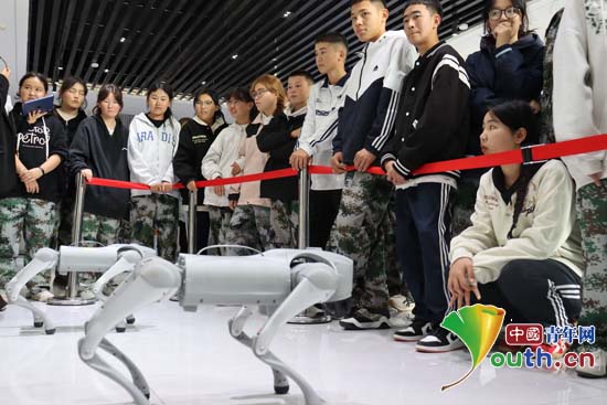 富蕴县高级中学的学生们在县科技馆参观机器狗。佳木斯大学研支团供图