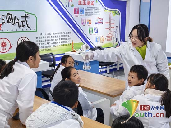 志愿者汤玉杰在给孩子们展示化学实验试剂。中国青年网通讯员姜政帅供图