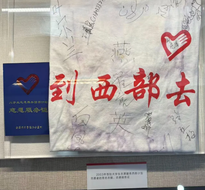那件签满名字的白色T 恤,静静挂在展柜里,早已不是一件普通的旧衣,而是西部计划志愿者团体的“无声纪念碑”:每一个签名,都是一位志愿者的坚守;每一道折痕,都藏着一段服务的故事。它纪念着所有把青春献给西部的西部计划志愿者,更见证着新疆从偏远边疆到璀璨明珠的蜕变,这份蜕变里,有他们在教育领域的“传薪”、在乡村振兴中的“赋能”、在民生服务中的“搭桥”,是整个西部计划志愿者团体与新疆同向而行的生动写照。