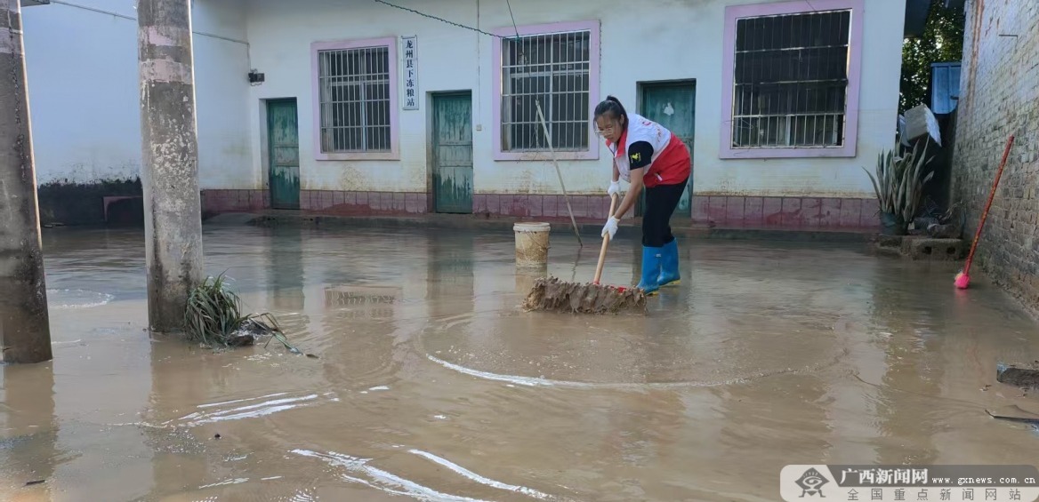 2025年10月,广西壮族自治区龙州县发生洪涝灾害。图为志愿者韦鲜在灾后清理淤泥。通讯员 吴永媛 摄