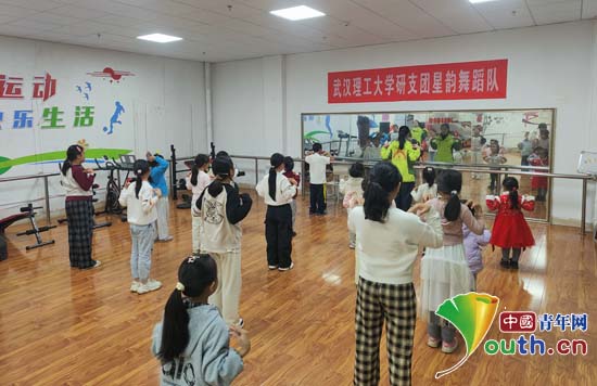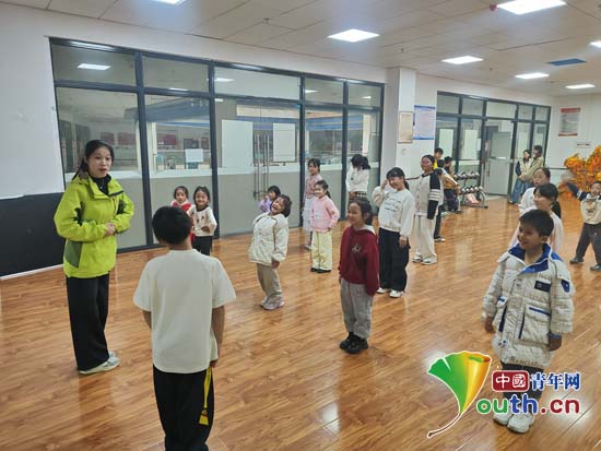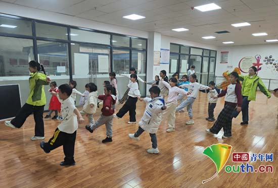 志愿者带领孩子们学习《向快乐出发》舞蹈。中国青年网通讯员姜政帅供图