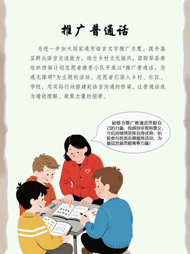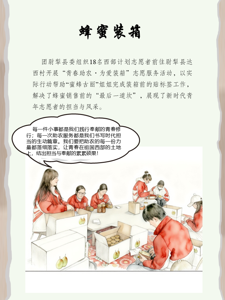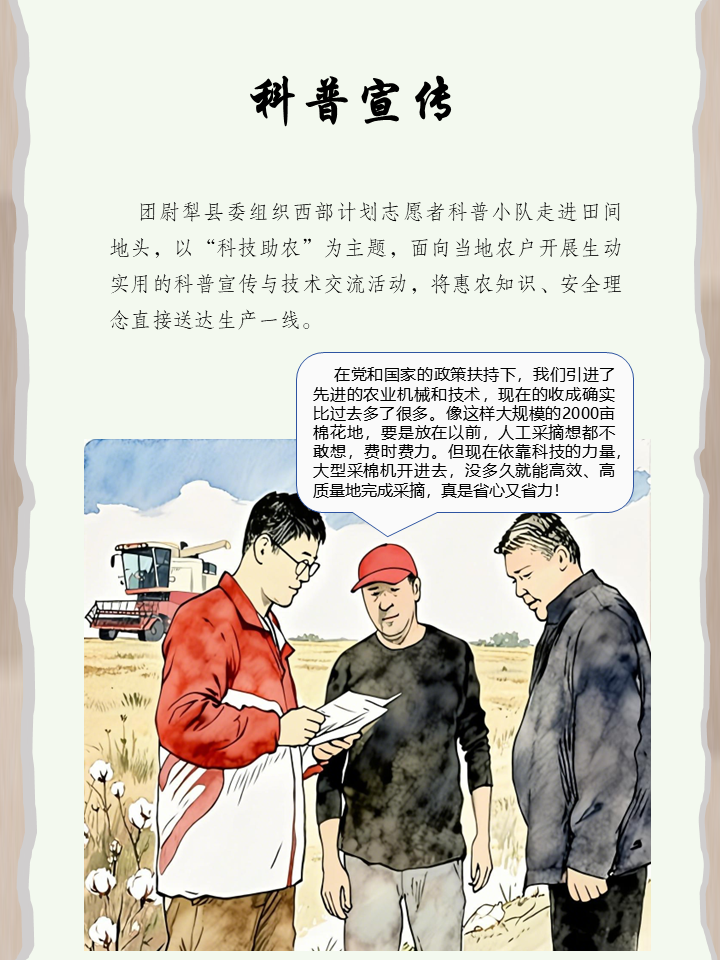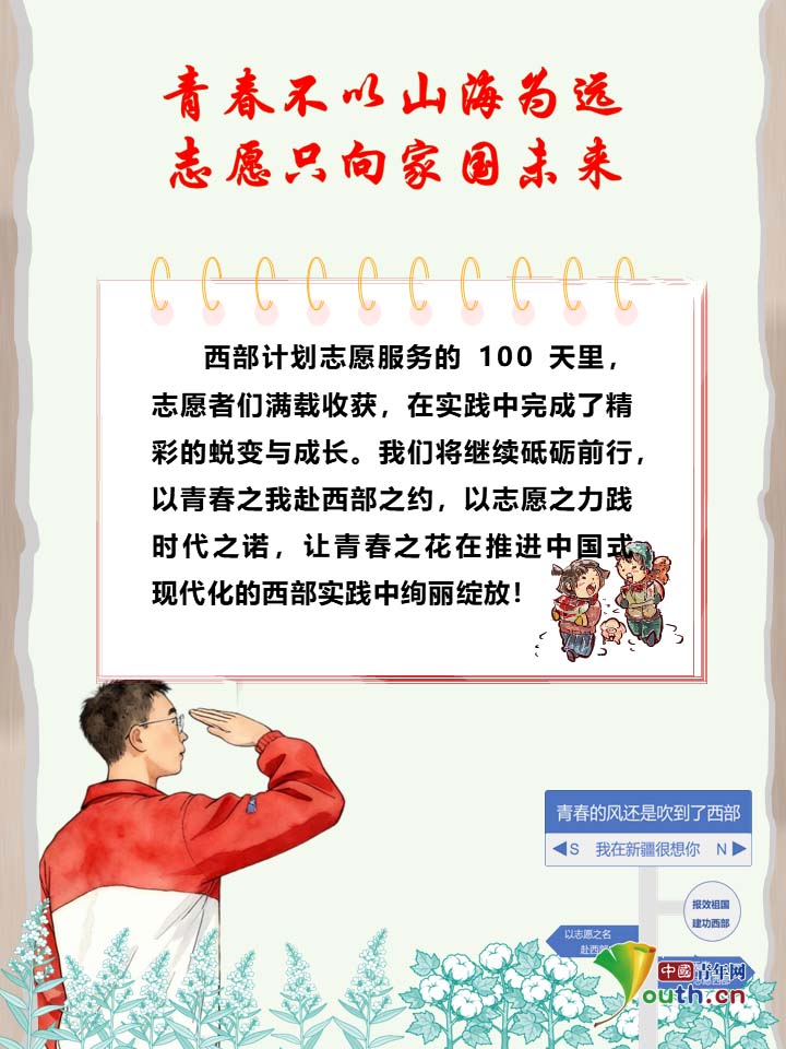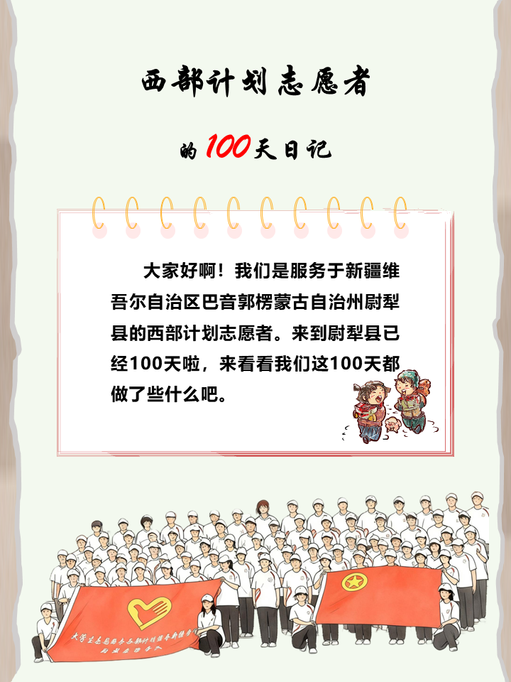 近日,服务于新疆维吾尔自治区巴音郭楞蒙古自治州尉犁县的西部计划志愿者,创作了一组漫画作品,展现了他们扎根尉犁县100天来开展的推广普通话、主题科普、国防教育宣传、墙绘以及助农增收等活动,以及他们在服务基层中发生的蜕变与成长。(记者 李彦龙 通讯员 胡滔)