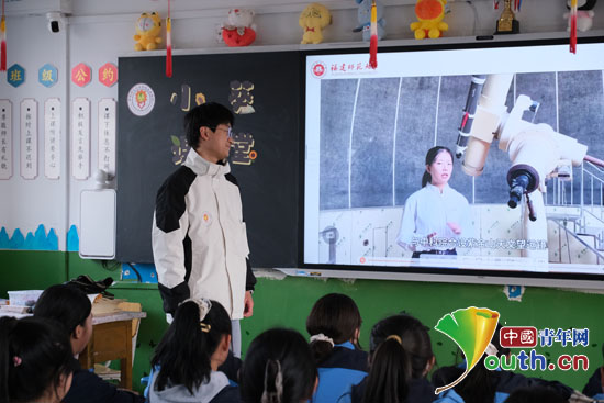 在福建师范大学地理科学学院的天文观测台前,研支团成员在线给孩子们介绍天文望远镜在探索宇宙方面发挥的积极作用。毕吴桐供图