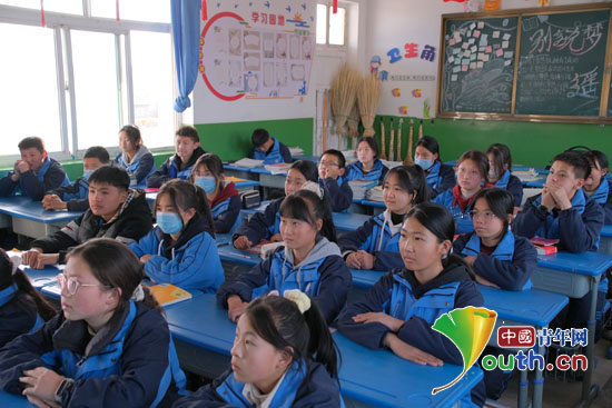 宁夏回族自治区固原市原州区杨郎九年制学校的学生们认真观看在线视频了解福建师范大学的校园设施。潘峻毅供图