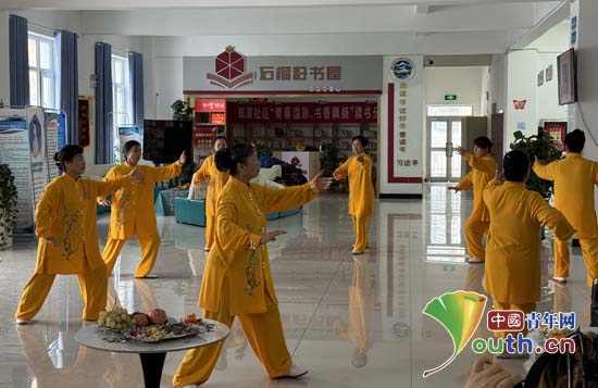 团新疆维吾尔自治区巩留县委联合巩留镇蝶湖社区组织开展“饺香情暖·冬至团圆”联欢活动。图为社区居民在联欢会上表演太极拳。团巩留县委供图