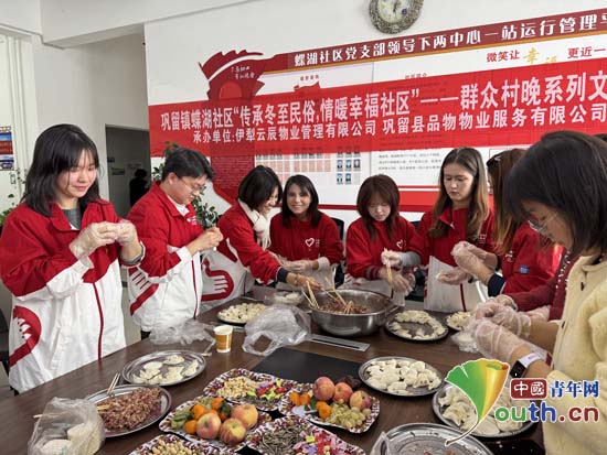 巩留县西部计划志愿者与社区居民一起包饺子过冬至。团巩留县委供图