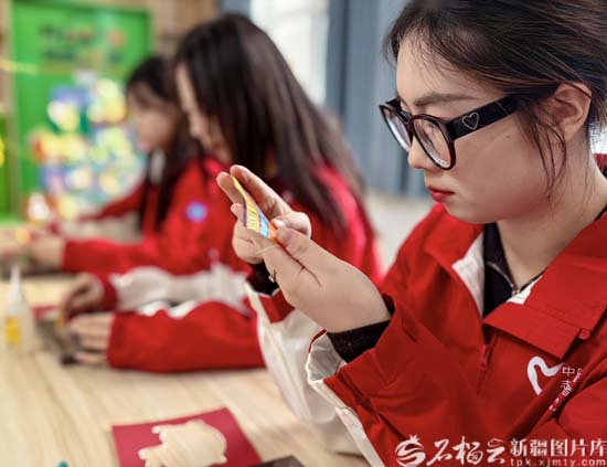1月17日,大学生西部计划志愿者在阿克苏市“青年之家”学习艾德莱斯绸制作方法。